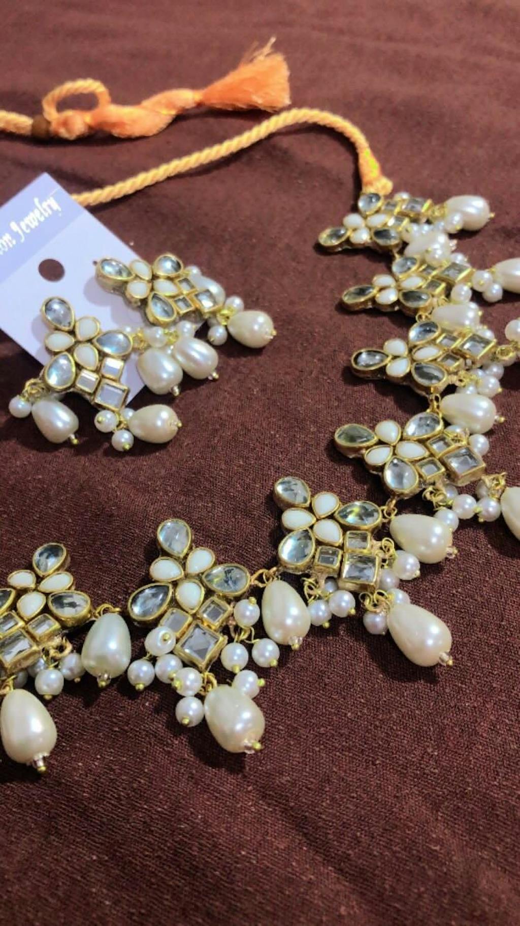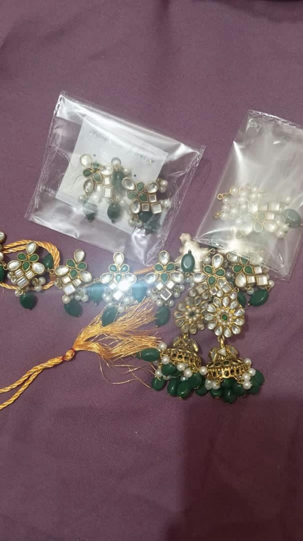 Elegant and striking, the Blush & Emerald Ensemble features a balanced mix of blush-toned and emerald-green stones, set in an intricate design with matching earrings for a complete traditional look.