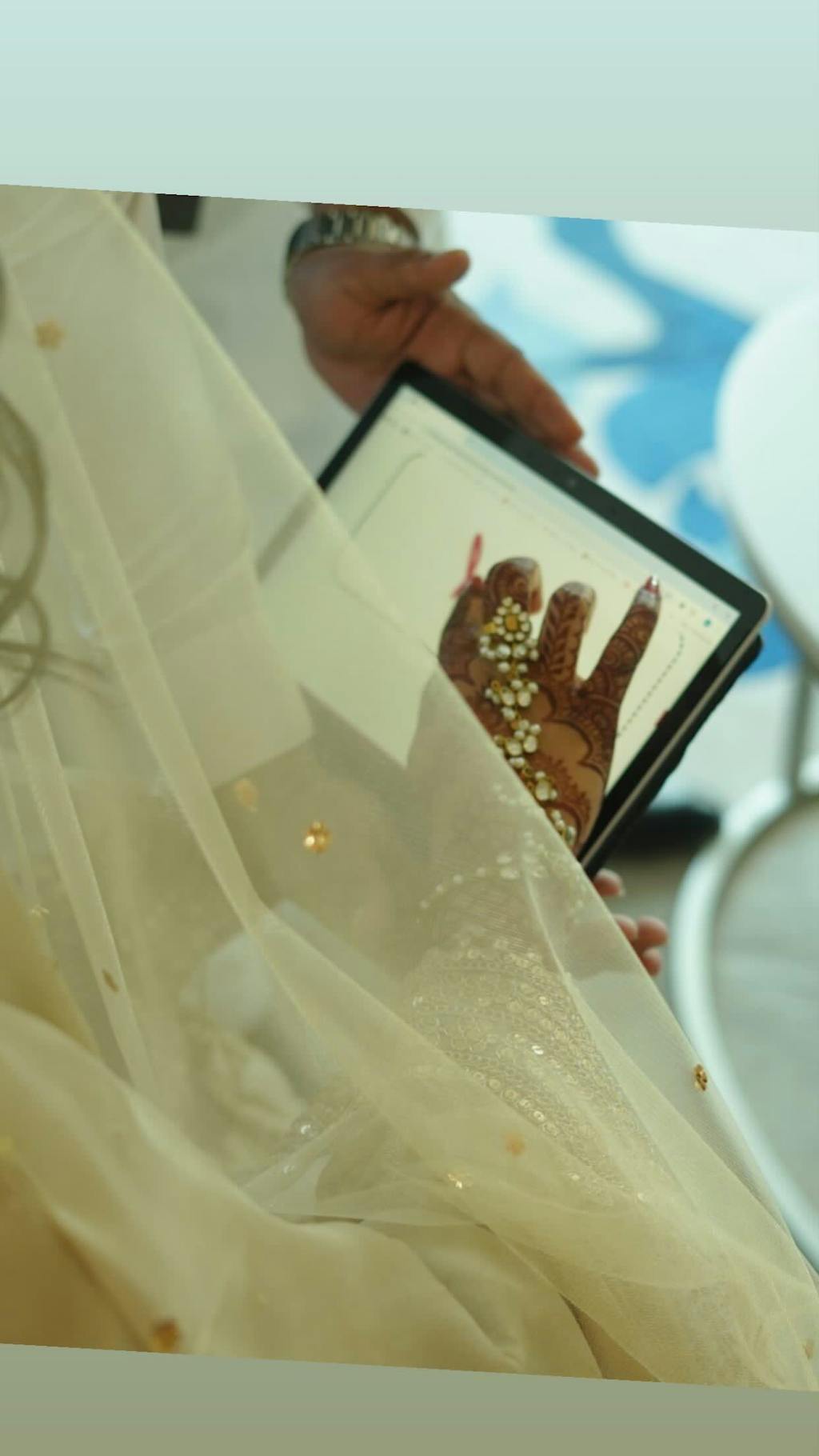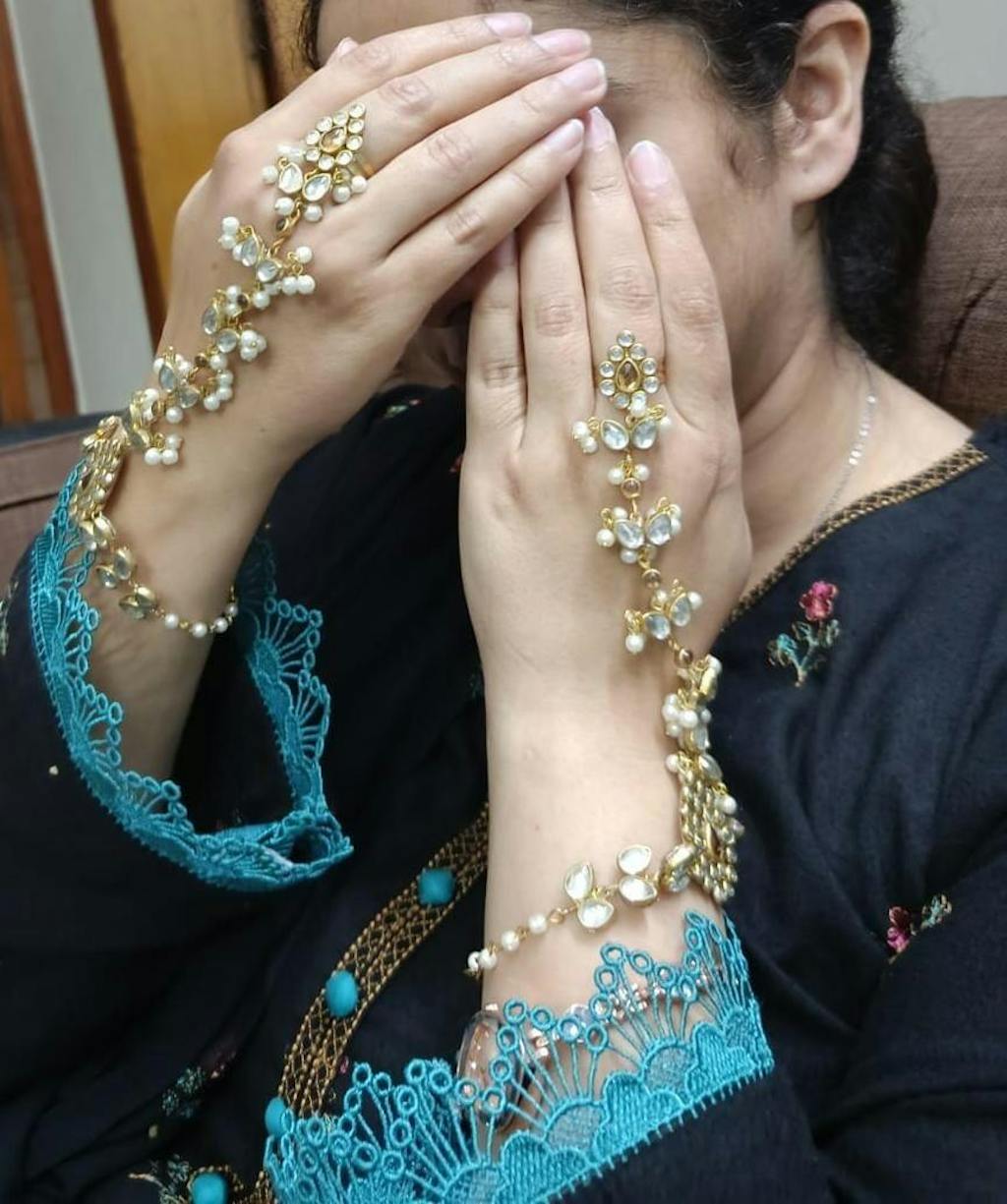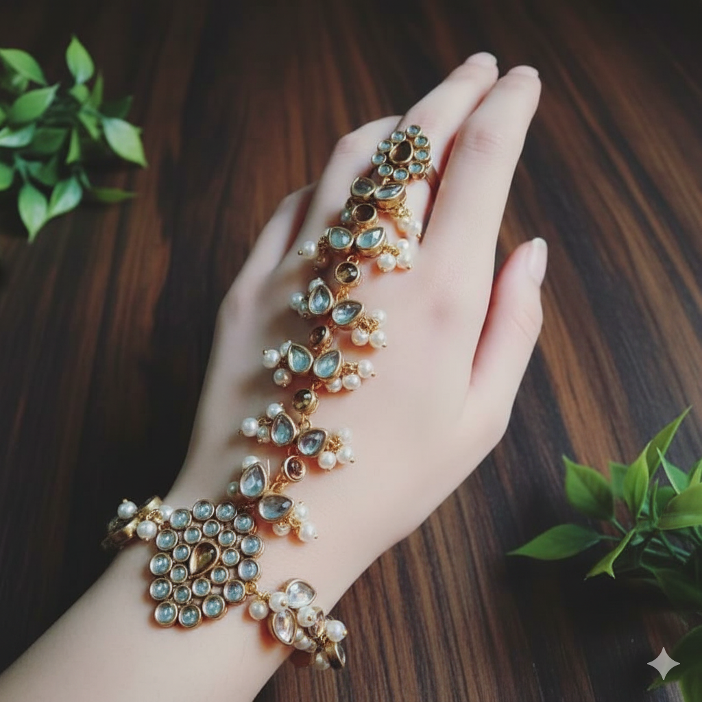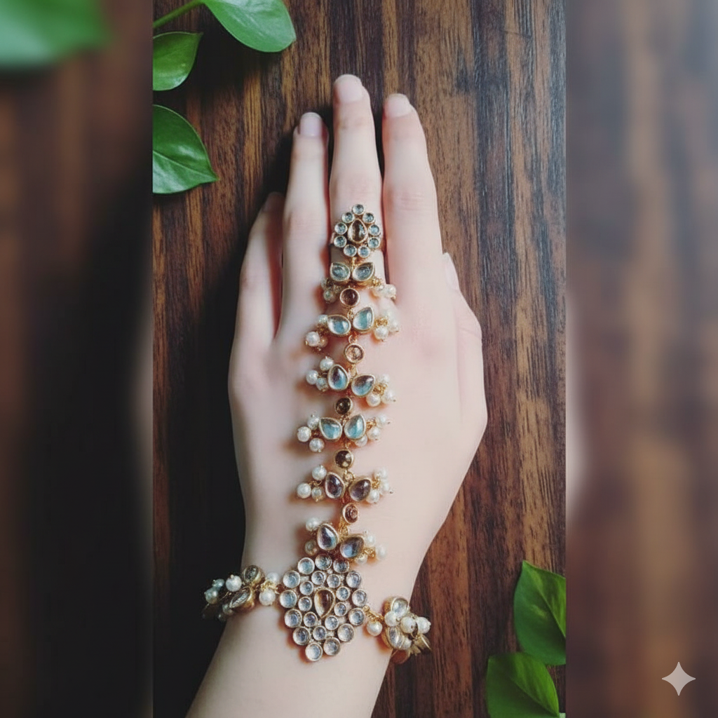 Champagne touch Aangla features artificial kundans with white pearls and champagne kundans designed as a haathphool that beautifully adorns the hand with grace and charm.