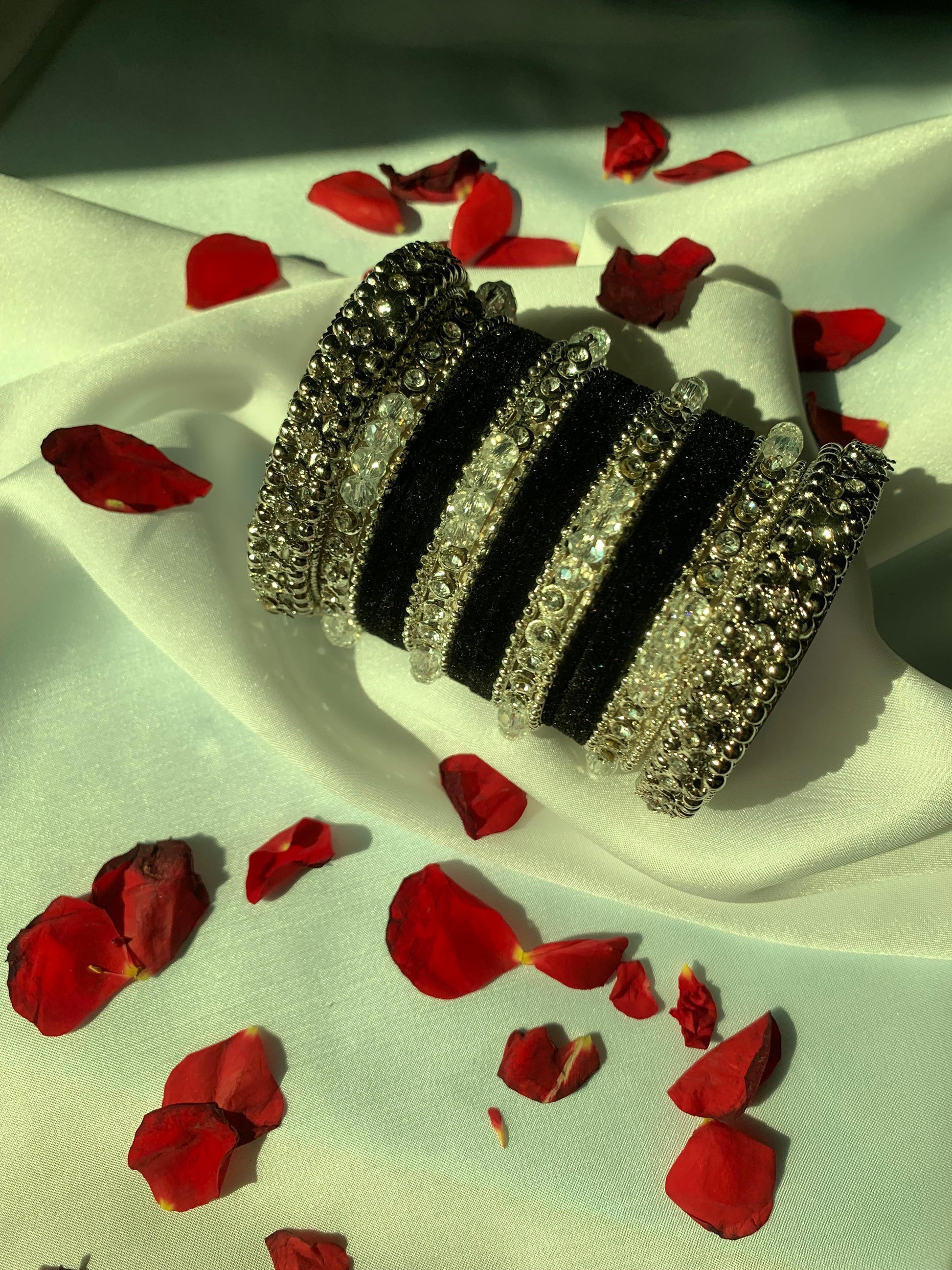 Elegant and radiant, the Chand Saaz Velvet Bangle Set blends the tone of silver karay and black velvet bangles in a refined design that elevates both casual and festive wear.