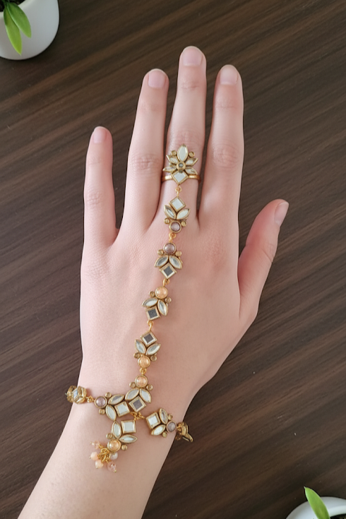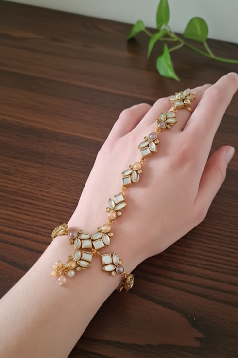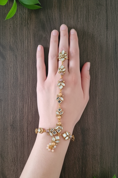 Crescent Glow Aangla features artificial kundans with white pearls and Golden and Purplish kundans designed as a haathphool that beautifully adorns the hand with grace and charm.