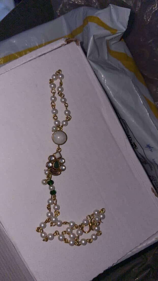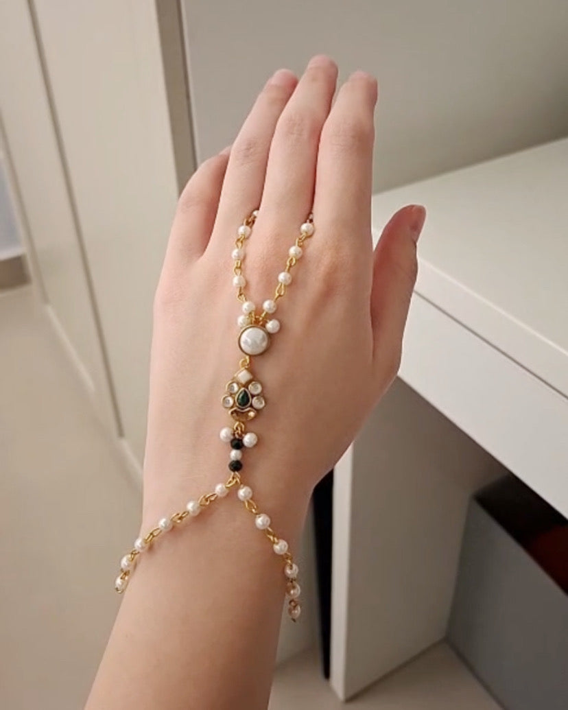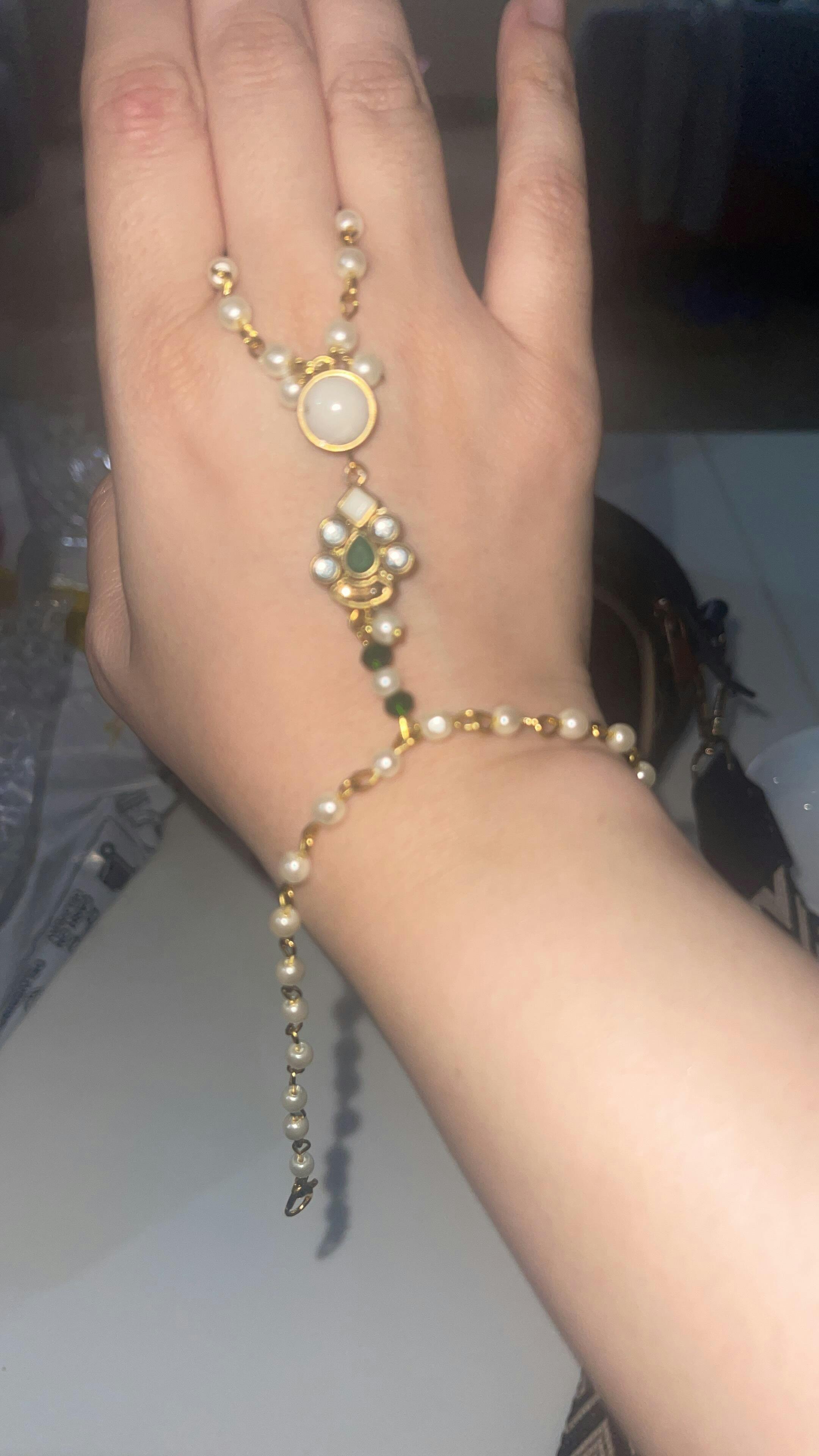 Elegant and traditional, the Green Stone Aangla features a central green stone accented with delicate zircon work, designed as a haathphool that beautifully adorns the hand with grace and charm.