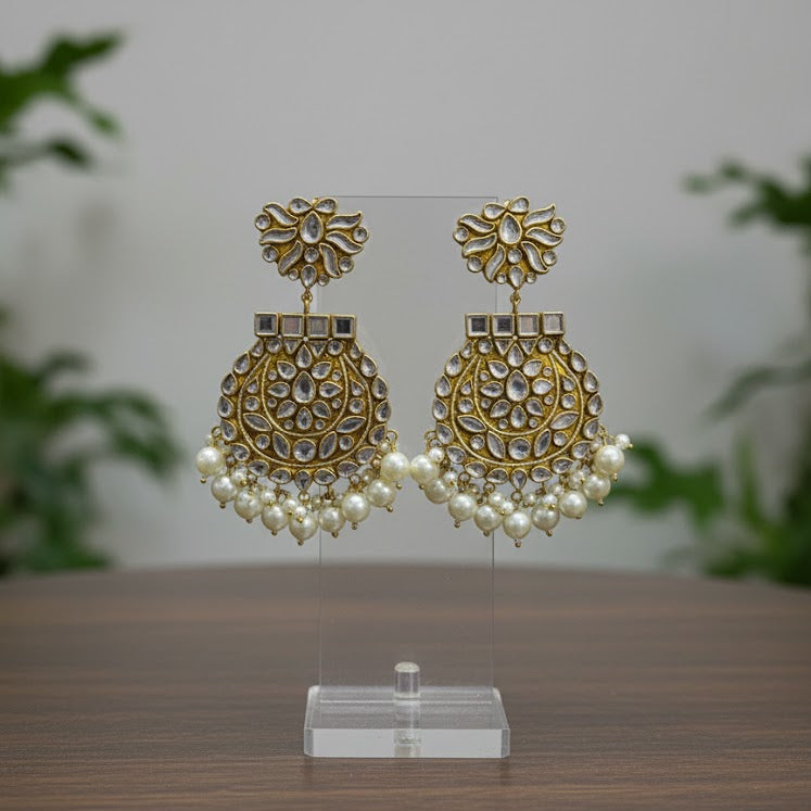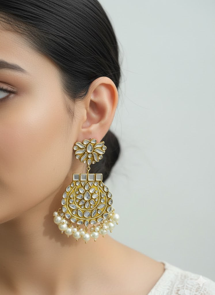 Kundan Mystara Earrings feature Silver Kundan with Dull Golden base artificial kundan stones, creating a regal look with timeless appeal.