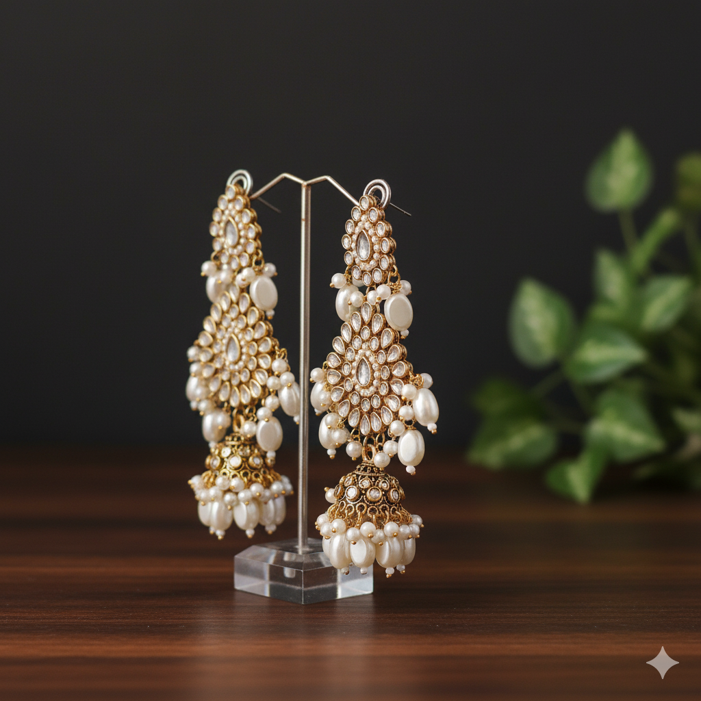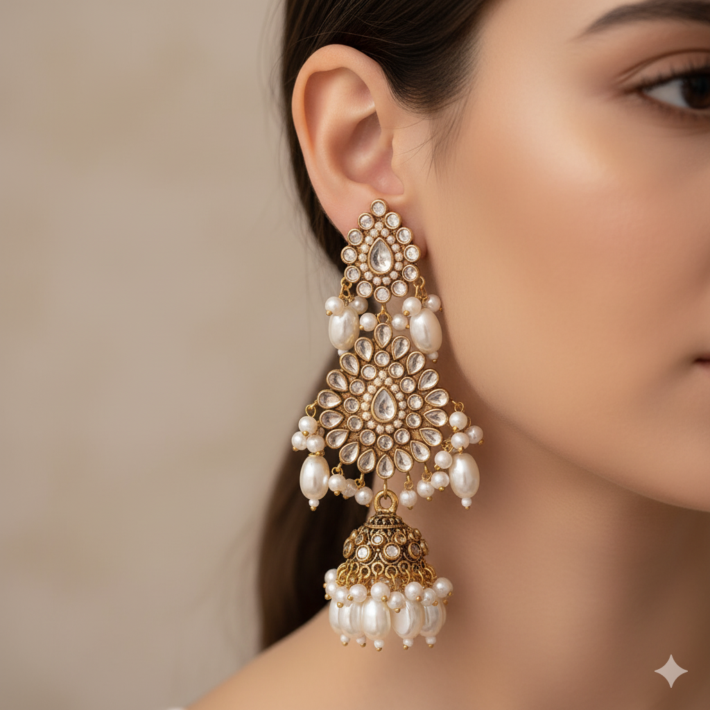 Large Traditional Jhumky feature champagne and silver artificial kundan stones with white flat shape pearls hangings.