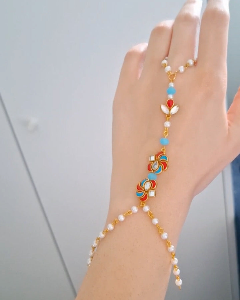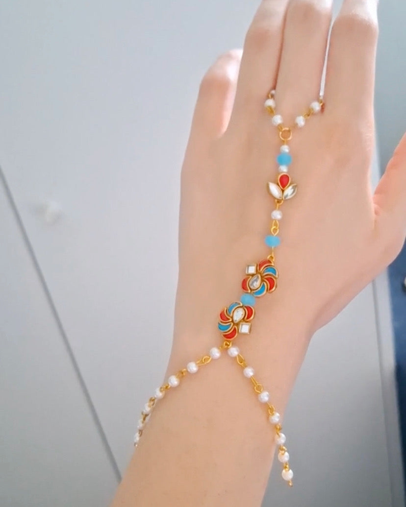 Vibrant and eye-catching, the Multi-Colour Aangla features a blend of coloured stones highlighted with delicate zircon accents, designed as a haathphool to bring elegance and charm to any traditional look.