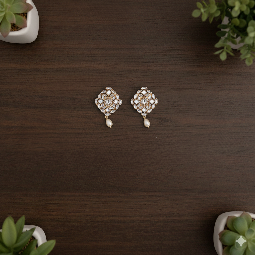Rich and captivating, the Nawab’s Legacy Choker Set features white drop shape pearl framed with intricate kundan detailing, paired with matching earrings to complete its regal presence.