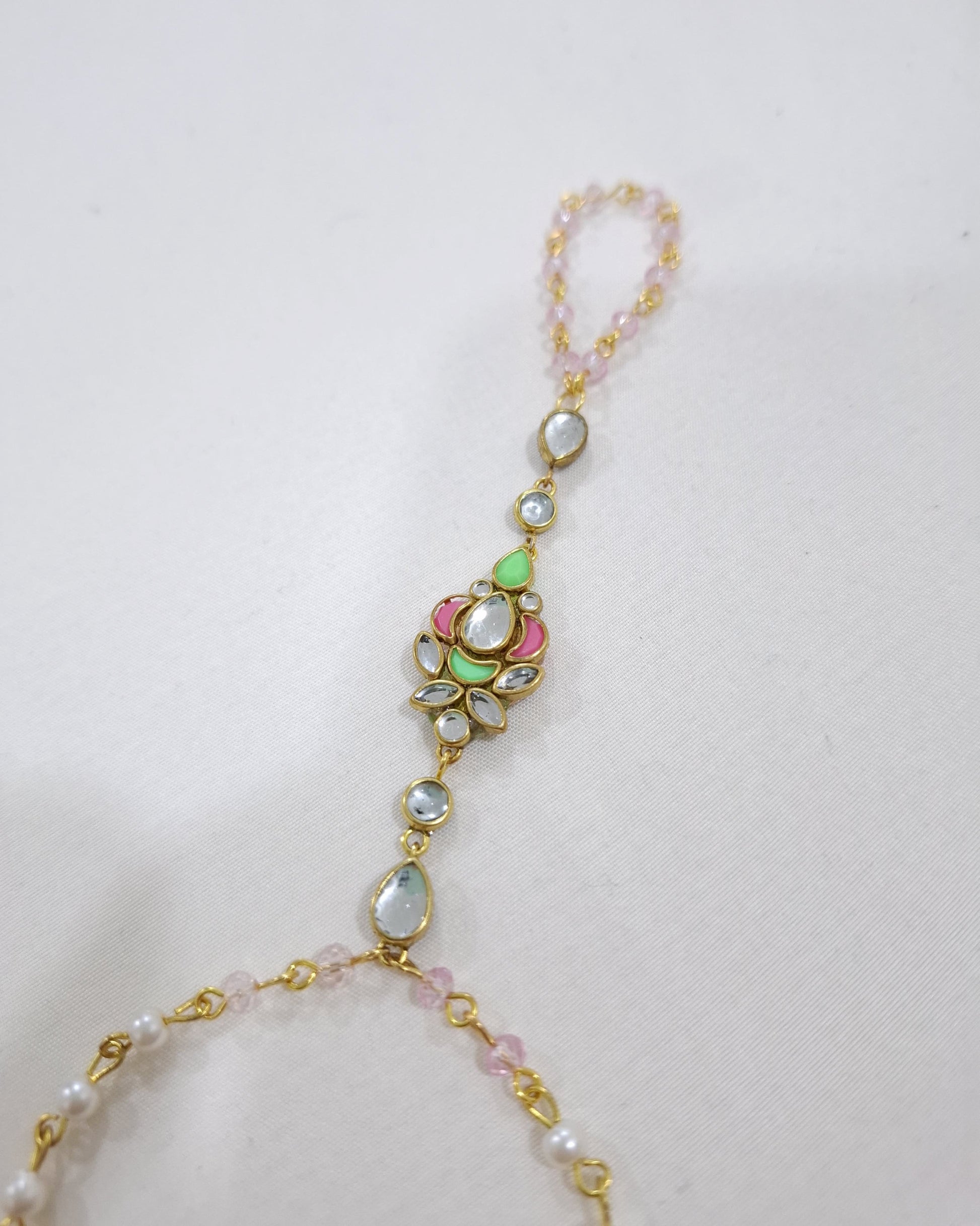 Graceful and radiant, the Orchid Glow Aangla features a floral-inspired design with luminous stone detailing and delicate zircon highlights, styled as a haathphool to add elegance and charm to the hand.