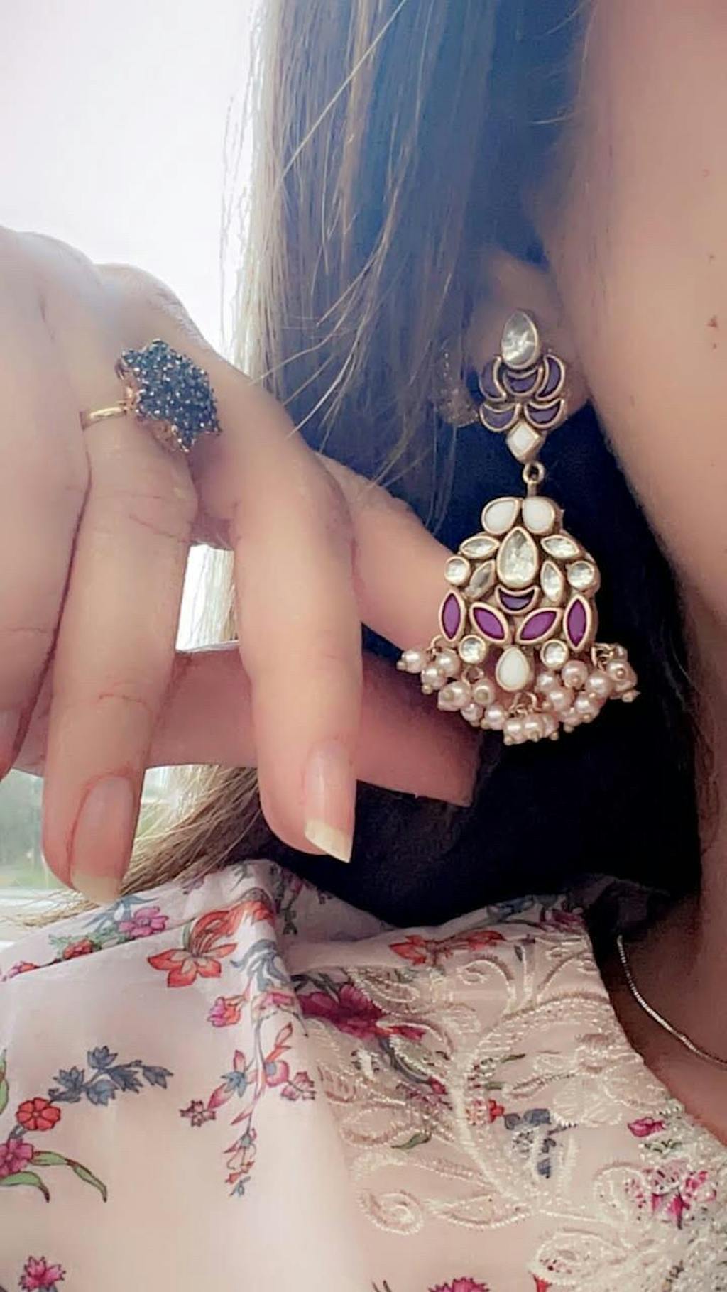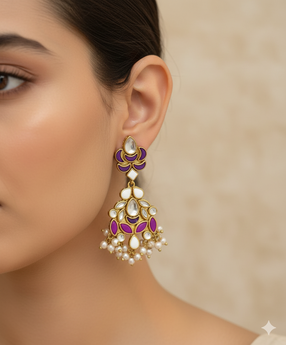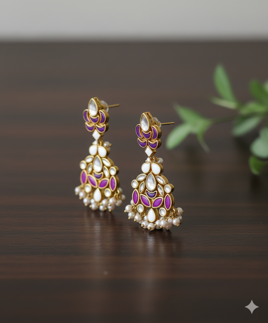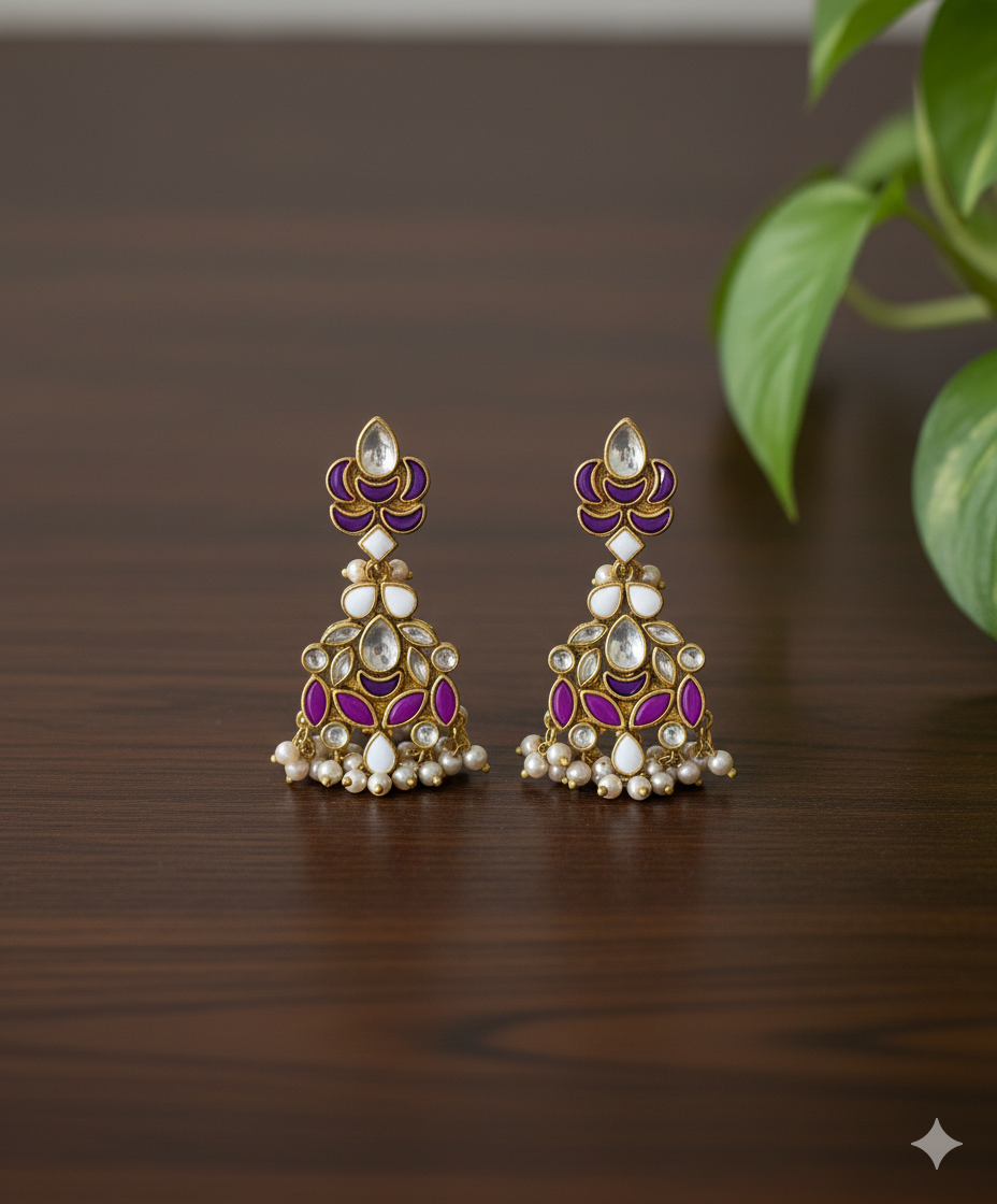 Purple Majesty Earrings feature a deep plum-toned design accented with delicate artificial kundan details, offering a modern yet timeless touch of elegance.