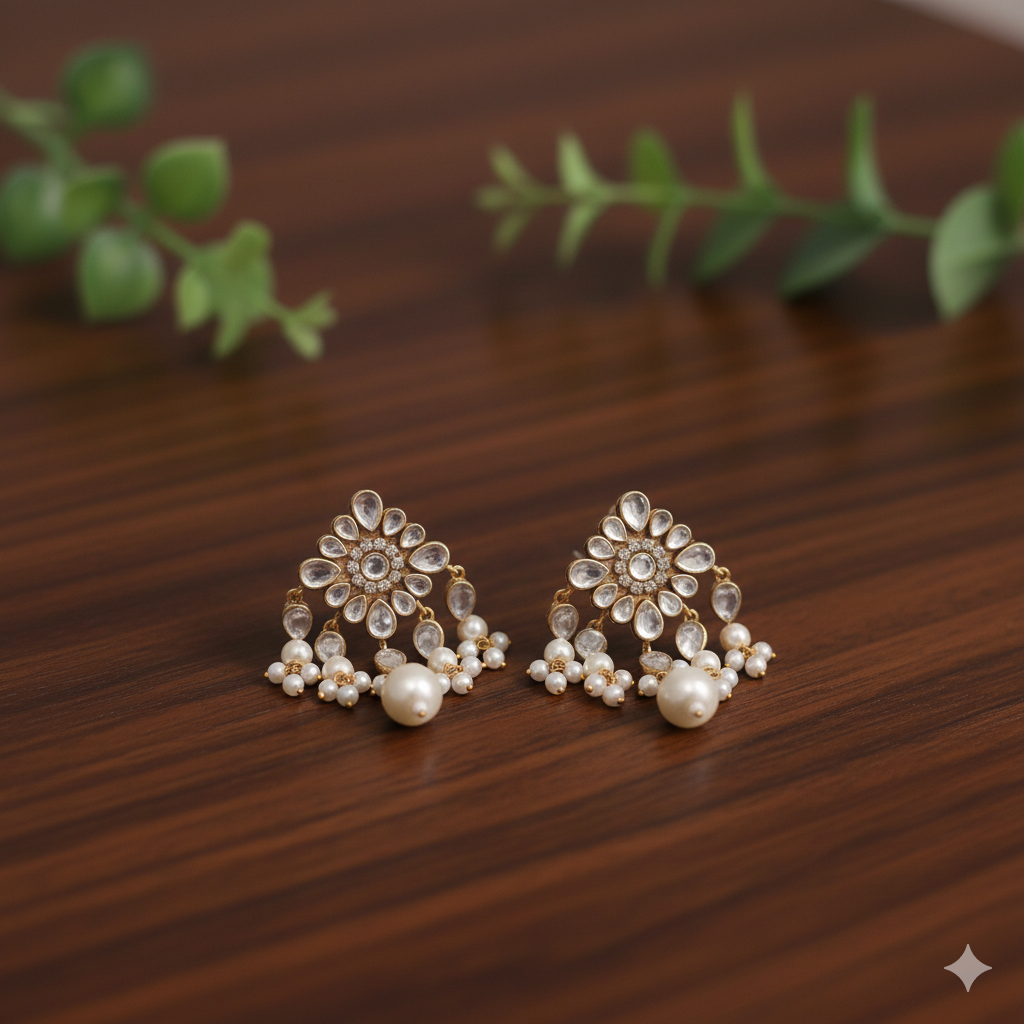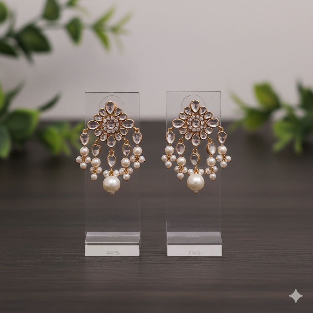 Zariya Drops earrings feature golden and silver artificial kundan stones with a 10mm pearl hanging, creating a causal look with timeless appeal.